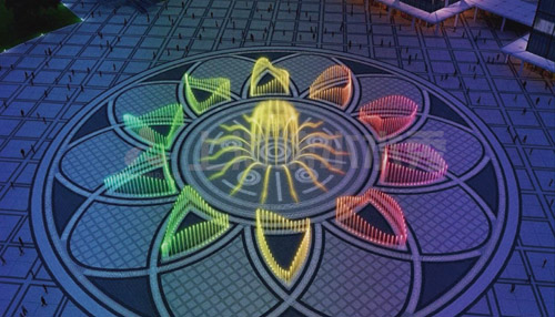 入口迎宾两侧激光交叉表演,炫目多彩,欢迎着八方来宾。人行道投影特效,时而鲜花铺满地,时而蝴蝶成群,时而龙飞凤舞。